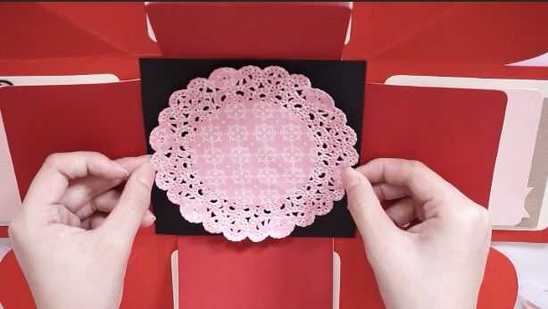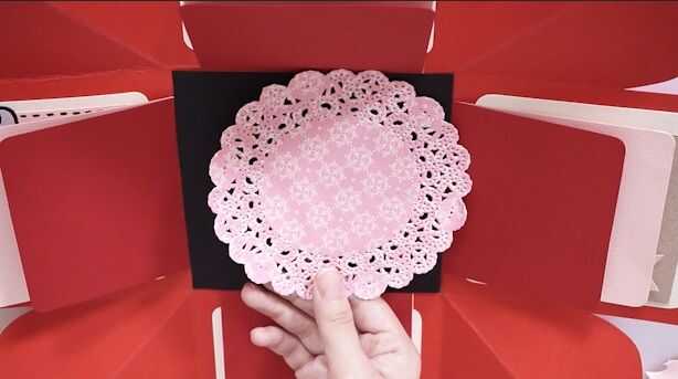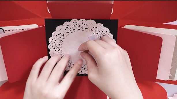 Pegar en un papel de dolly de cordón en el centro de la tarjeta de la caja para hacer tu caja de torta de explosión parezca más realista. (Es un bono para embellecer tu pastel ficticio!)