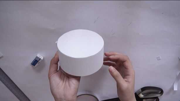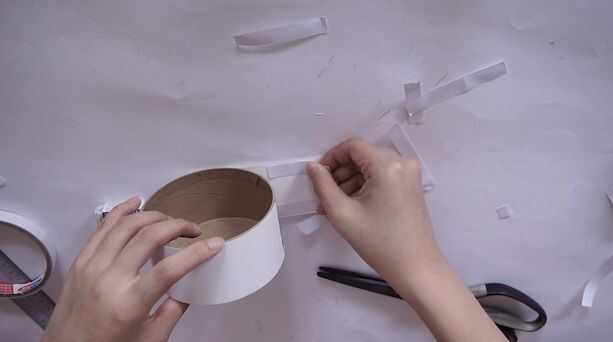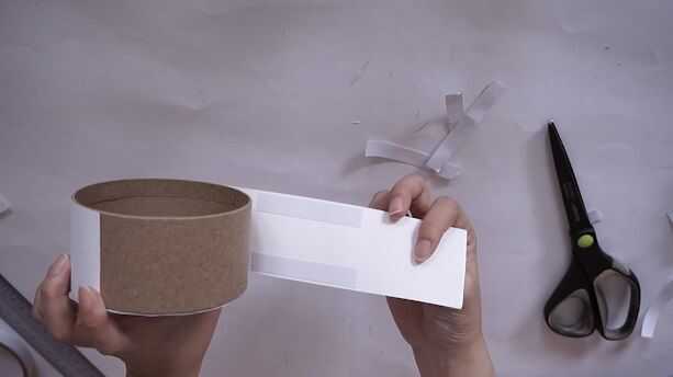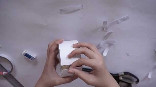 Para sujetar la tira perfectamente y exactamente, primero pegue en un pequeño trozo de cinta de doble cara en la caja de ronda. (si su caja redonda tiene un lado con una "línea", usted debería pegarlo allí para que se vea más profesional más adelante. Ver la última imagen del paso 14 para mejor referencia)