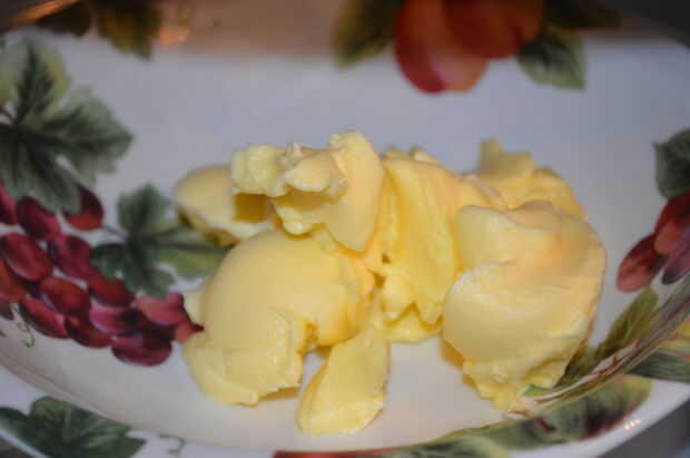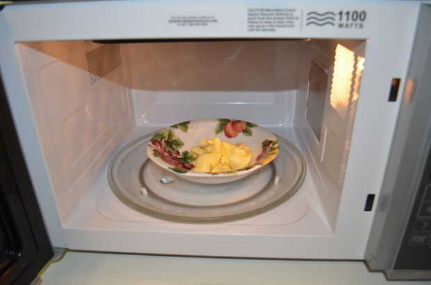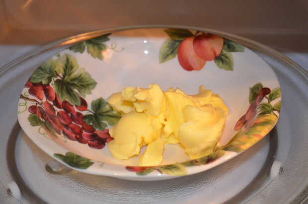 Mida 6 cucharadas de mantequilla y poner en un bol apto para microondas. Derretir hasta su realmente melty. Vierta en la cacerola.