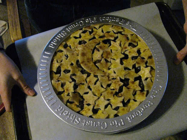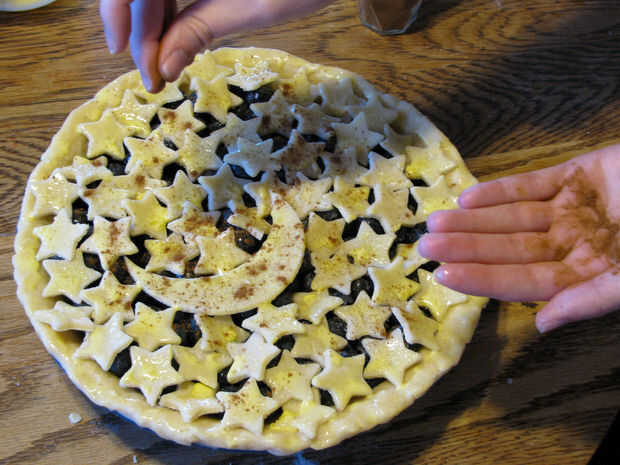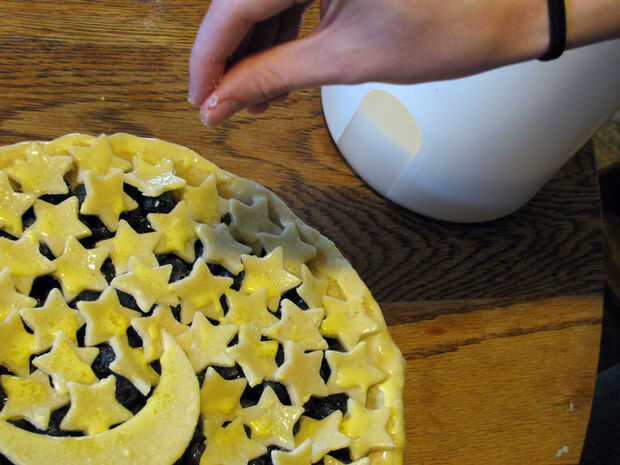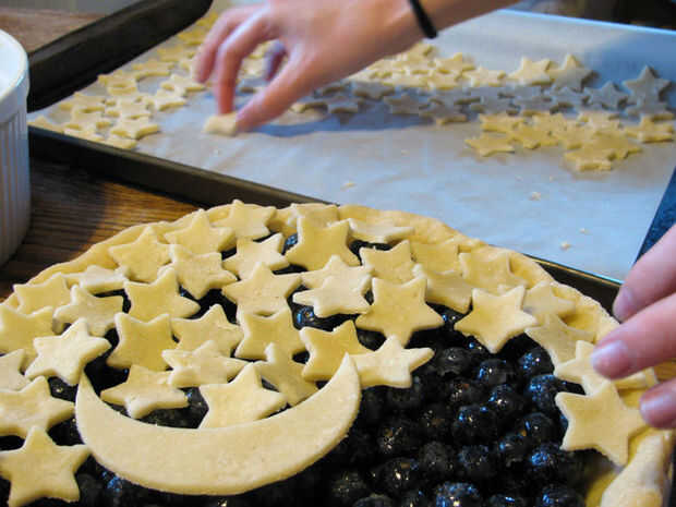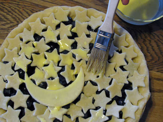 Retire la tarta del fondo del refrigerador. Usando una brocha de cocina, pincel una fina capa de clara de huevo sobre la corteza de la parte inferior. Esto evitará que el pastel cada vez empapado. Añadir los arándanos relleno en la tarta. Saque del refrigerador la luna y las estrellas y ponerlas en el pastel, a partir del trabajo exterior y superpuestas ligeramente las formas.