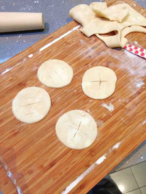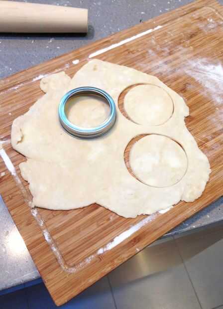 Rellenar las cortezas precocidas y tapas para cortar un círculo para pastel. Añadir algunas ranuras para la corriente de escape.