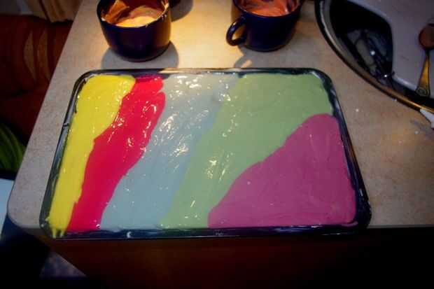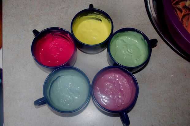 Dividir la mezcla en diferentes recipientes y agregar colorante de alimentos diferente a cada uno. Mezclar un poco en el tiempo hasta que estés contento con él. He añadido un pequeño extra porque encuentro que los colores normalmente no se muestran tan bien después de la cocción.