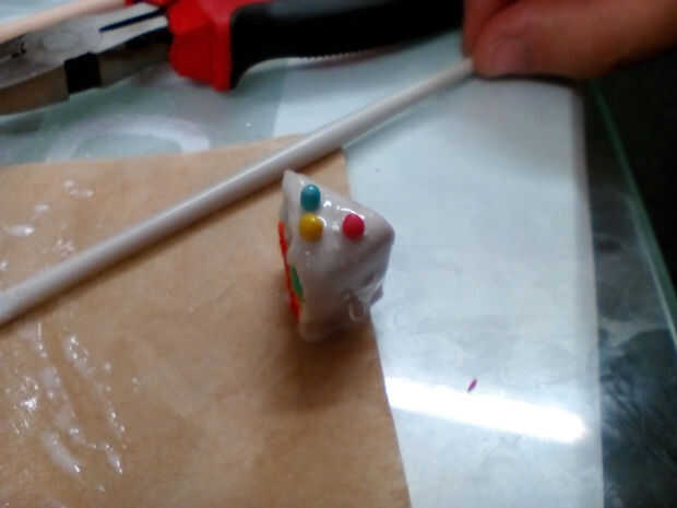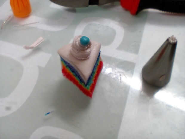 Puede cocer al horno su pastel como lo es ahora - pero me gusta para que mi torta bien decorada! Use una boquilla de tuberías pequeñas para pequeñas cantidades de glaseado. Me gustaría añadir más brillo a la arcilla que uso para este paso. Colocar cuidadosamente en la parte superior de tus rebanadas de pastel.
