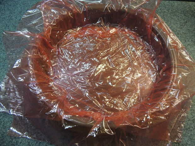 1. Utilizando 2 hojas de envoltura de plástico, el interior de la bandeja de pasteles de línea y presiona a lo largo de la parte inferior y los bordes.