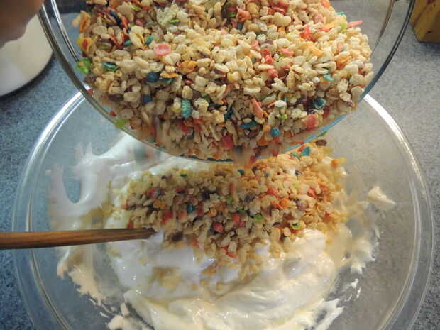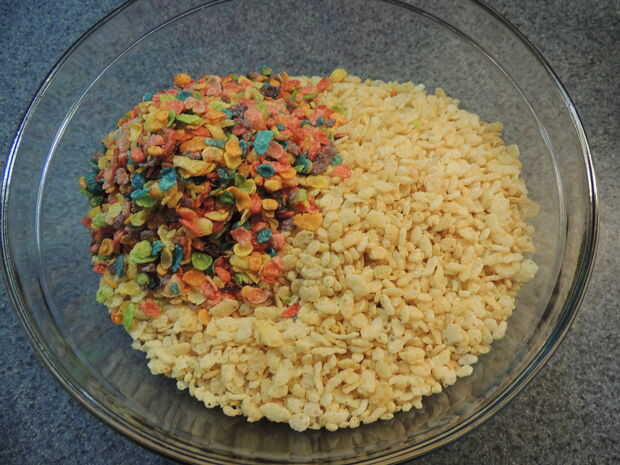 1. Mezclar los dos cereales en un tazón mediano para distribuir uniformemente las escamas coloridas.