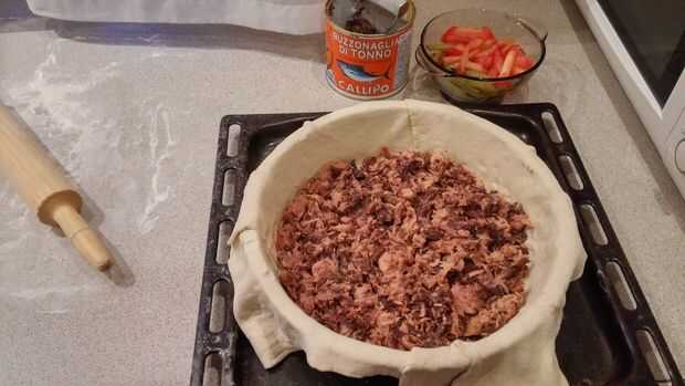 añadir el atún en la parte inferior (Antes de atún, última vez cubrí la masa con mostaza y degustar buena también)