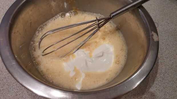Añadir los huevos mezclados, crema agria y harina encima de todo