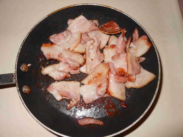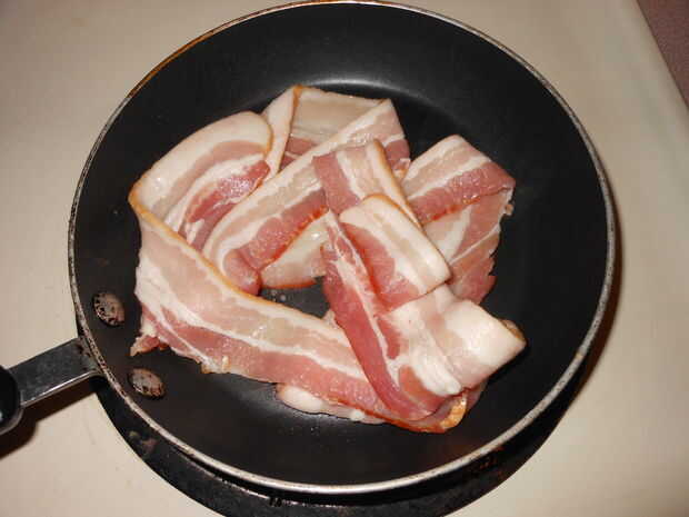 Primero, necesitamos algunos bacon bien hecho a desmoronarse en el desmoche.