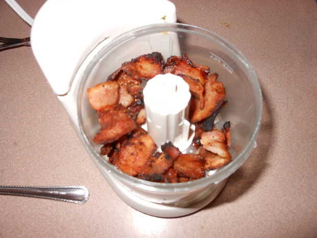 Cocinar simple tres o cuatro tiras de tocino hasta que estan bien hechos y enfríen en un plato con una toalla de papel.  Cuando haya enfriado, se desmoronan o ejecutar a través de un procesador de alimentos.