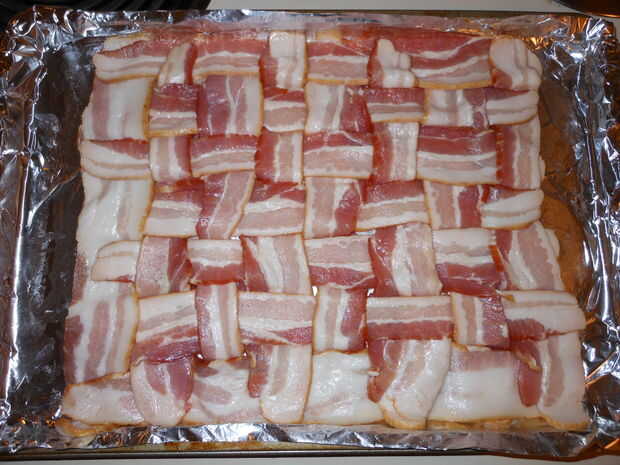 En una placa para horno forrada de papel de aluminio, colocar 7-8 tiras de bacon al lado. A lo largo de un borde, doblar cada otra tira de espalda tocino un poco y poner otra tira de tocino a lo largo de este borde y doblar que las tiras de nuevo sobre él.