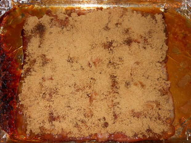 Otra cosita que aprendí de EMT. Encienda el horno a 425F (aproximadamente 220C). Frotar una buena cantidad de azúcar moreno por toda la parte superior de la armadura y poner en el horno. Compruebe cada diez minutos o así, hasta que se inicia a dorarse bien.