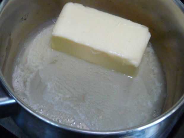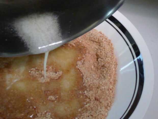 Añadir la mantequilla derretida a la mezcla de la miga. Revuelva bien para combinar. La miga debe sostener juntos cuando se pellizca. Si no, añadir más mantequilla derretida cuando sea necesario.