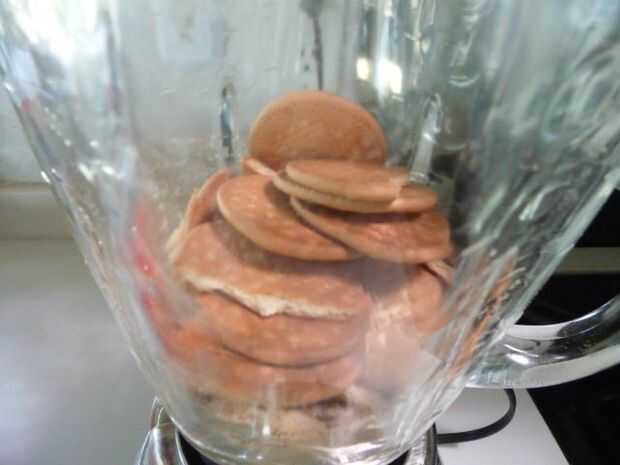 En una licuadora (o procesador de alimentos), utilice la velocidad más baja a explosión-mezcla las galletas hasta que se asemejan a las migas de pan. Trabajar en lotes pequeños. Poner en un tazón mediano.