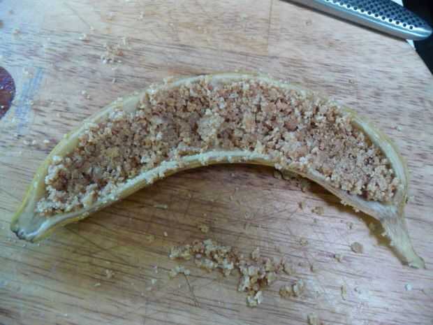 Difundir unas cucharadas de la mezcla de galletas a lo largo de la cáscara. Utilice el pulgar y el dedo índice suavemente (pero firme) pulsar en la cáscara de plátano y los lados, dejando un pozo abajo del centro. Otra mano para mantener el plátano en la forma como la corteza de galleta se presiona dentro de la cáscara.
