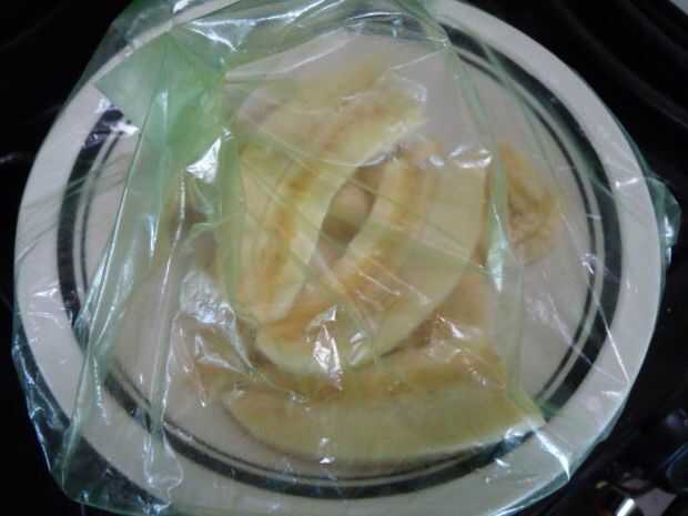 Coloque la fruta en un bol, remover y descartar cualquier banana residual "cuerdas" en la fruta. Coloque el recipiente dentro de una "bolsa verde". Plegar la parte superior de la fruta y refrigerar.
