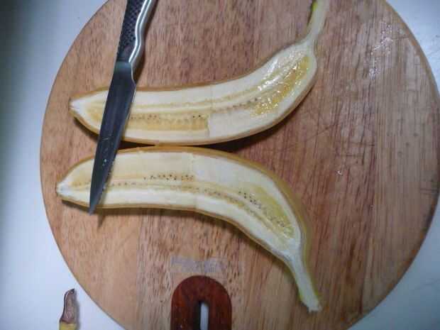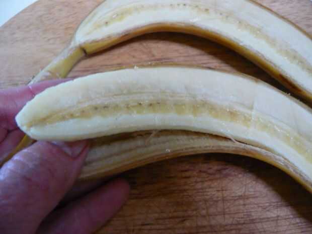 Uno a la vez, mariposa-corte un plátano por la mitad, longitudinalmente. Use su pulgar para separar suavemente la fruta de la cáscara.