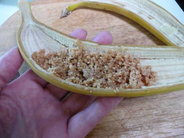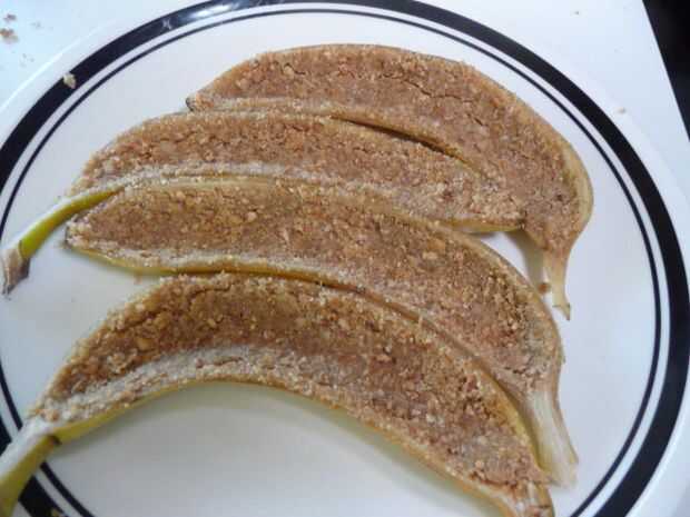 Coloque la cáscara costrosa sobre una placa para horno y repita el proceso hasta que todas las cáscaras de plátano tienen una costra de galletas dentro.