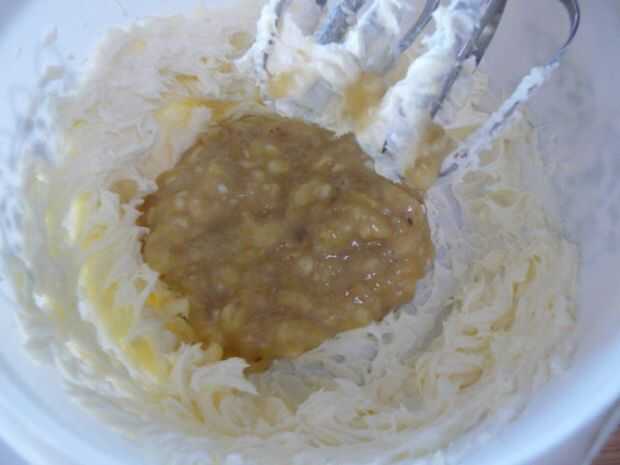 Añadir el puré de plátano a la mezcla de queso crema. Batir juntos hasta completamente combinados. Gusto por la dulzura. Añadir más azúcar (poca cantidad) si se desea.