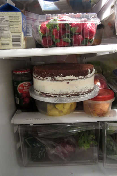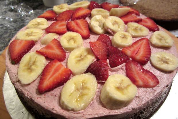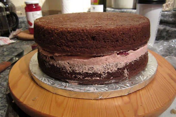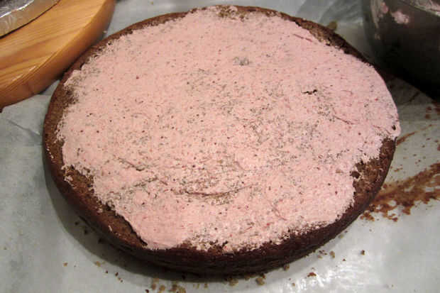 Extienda una capa muy delgada de la crema de fresa sobre la parte cortada de la segunda capa. Esto actuará como un poco de pegamento para evitar que la torta de deslizamiento la fruta mientras trabaja con él. Invierta la capa y coloque en la parte superior, asegurándose de que la parte inferior de la capa es hacia arriba.