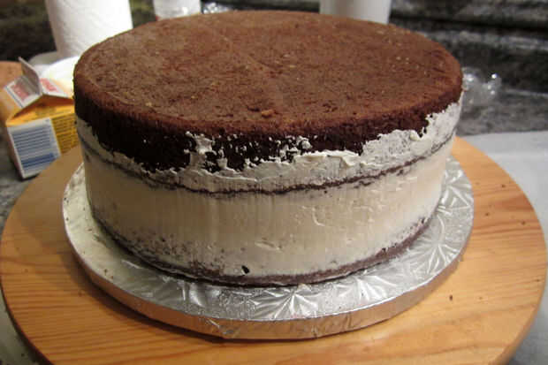 Use la crema de vainilla y la espatula recta para rellenar los grandes huecos entre las capas. Poner esto en la nevera por 15-20 minutos; Luego, cubrir el resto de la torta. Hice una capa de miga y luego una capa final y había raspado suave con el raspador de mi banco. Tenía la intención de sacar más fotos pero estaba en la zona con mi adhesiva y no pensar en ello.