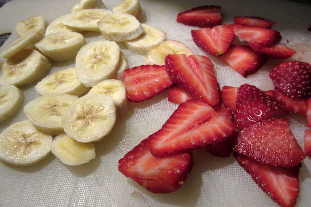 Tomar un plátano maduro grande y 4-5 fresas maduras y cortarlas.