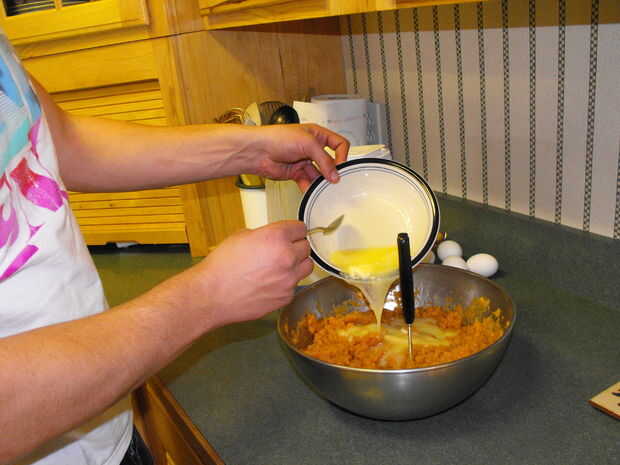 Después de agregar el azúcar, agregar 1\2 tazas de mantequilla derretida y revolver. Luego haz un tazón pequeño batir cuatro huevos bien y añadir en el bol y mezclar. Añadir que la vainilla de 2 cucharillas con la lata de dulce y leche condensada. mezclar hasta que todo se mezcla suavemente. el paso final relleno es verter en un pans de pastel de 8 pulgadas 9 x 13 o tres.