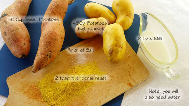 3. los papas y batatas - el puré con la leche y la levadura nutricional (crema y mantequilla lo hará más cremoso y suave). Incluso puede añadir un huevo si quieres ser más decadente.