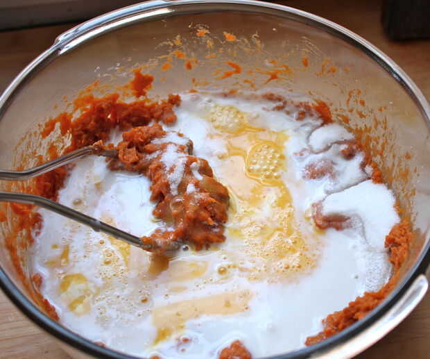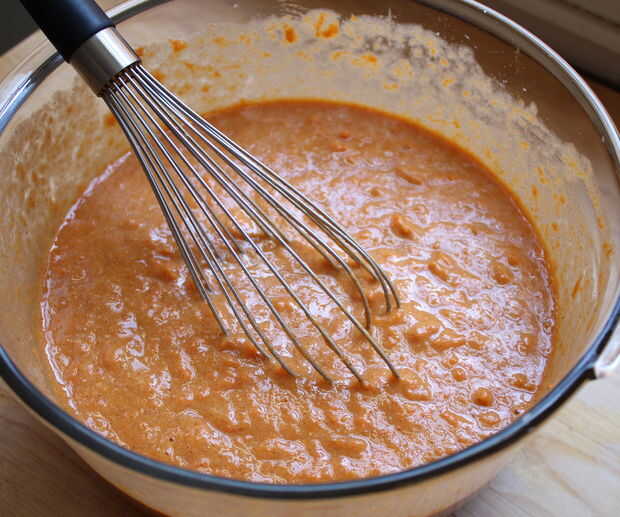 Batir esto durante un minuto o dos, hasta que todo está bien combinado. Si ves los trozos grandes de patata dulce, dude de romperlos para arriba. :)