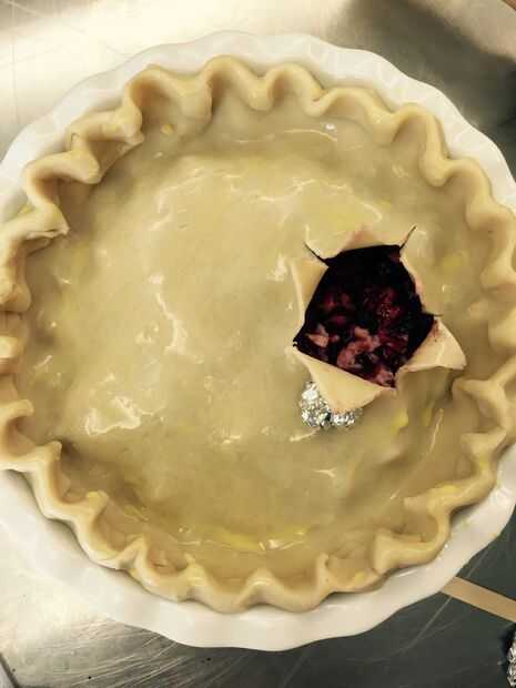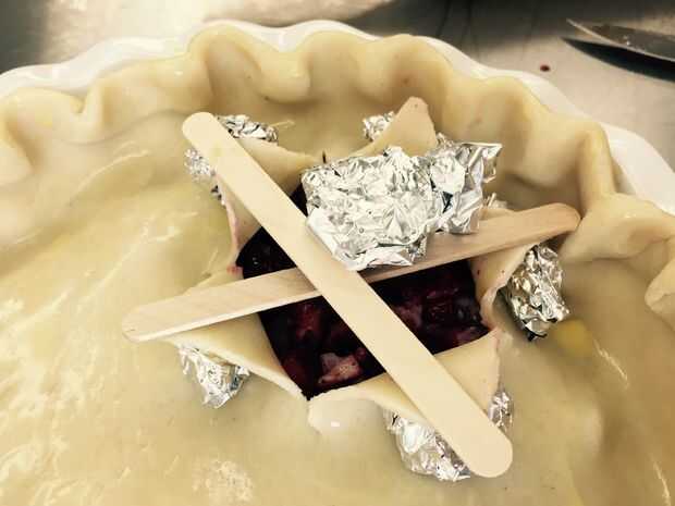 Suavemente el rodillo los bordes de su orificio y utilizar soportes para mantenerlos en su lugar como gustaría a cocinar. He utilizado bolas de papel de aluminio para apoyar la parte inferior de la tarta, y palos de paleta para peso suavemente la parte superior hacia abajo. He decidido no usar palillos de dientes para evitar antiestéticos agujeros.
