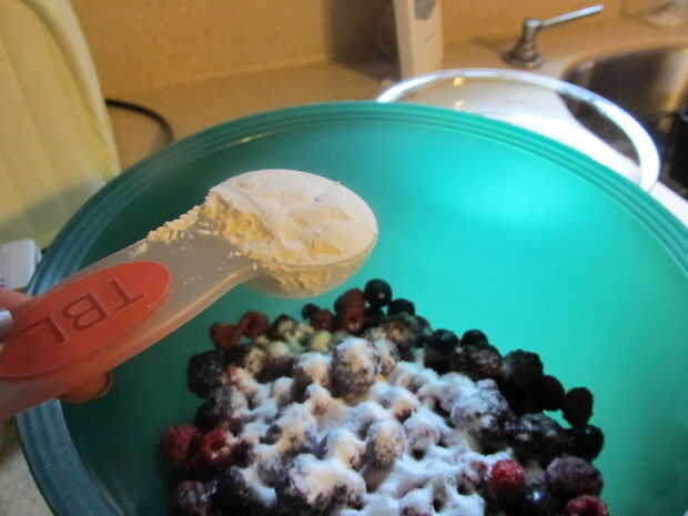 Medir 3 cucharadas de maicena y agregarla a las bayas y el azúcar