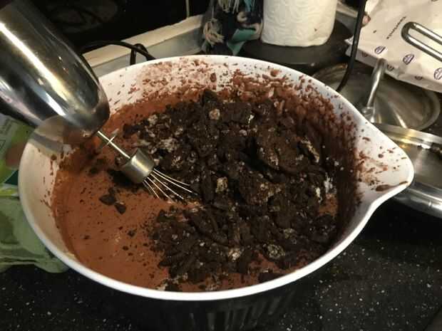 Crunch encima de la galletas Oreo sin embargo desea un puesto en la mezcla para pastel.