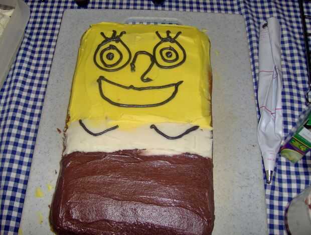 Esta tarta de Bob esponja 3D era muy difícil crear derecho para arriba.Yo al horno tortas vainilla 6 de 6" y cortarlas para ser tortas de 4" x 6". Luego apilados los tres primeros con crema dura. Entonces tuve que insertar una sección de es