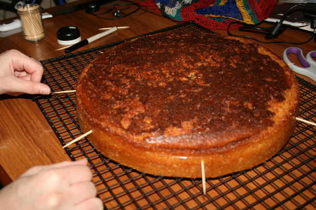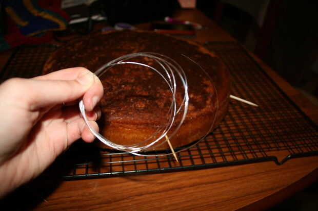 Ahora tomar algunas nuevas lineas de pesca, envuélvalo alrededor de la torta, colocar debajo de los palillos de dientes, como si vas hacer el pastel, en vez de atar para arriba aunque, tire de cada extremo de la línea de pesca.