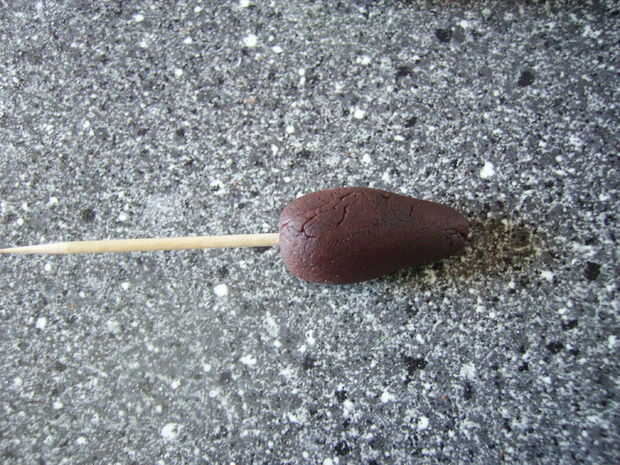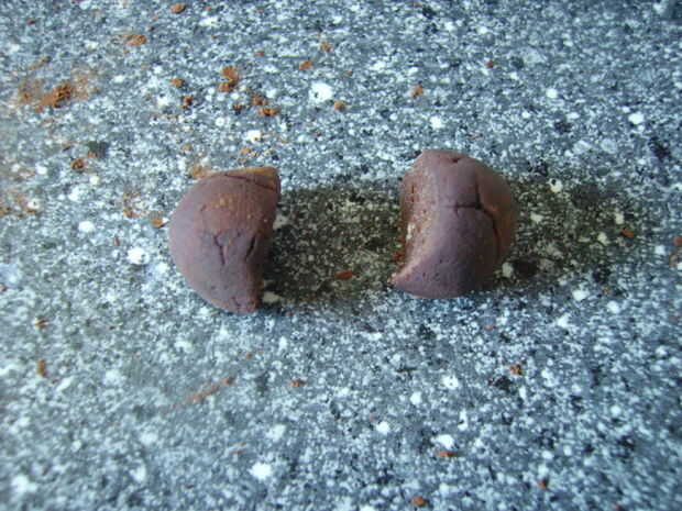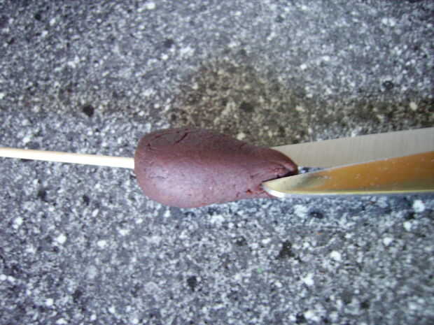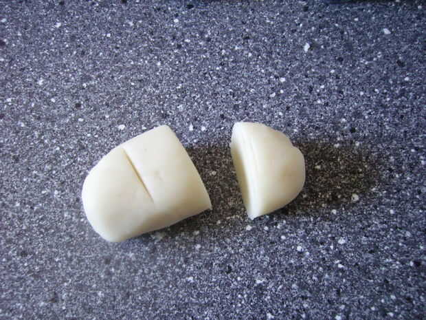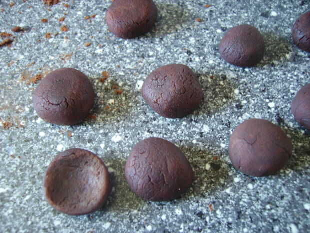 Tome el mazapán marrón y pequeñas bolas del rodillo y cortar en la mitad, darles forma redonda y en un lado slightely "cóncavo" (ver las fotos de la forma)