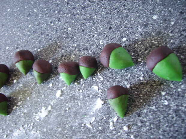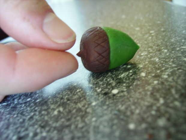 Ahora tome una pequeña cantidad de mazapán verde forma inte un cono, se unen el cono y la parte marrón y modelo en forma de bellota.