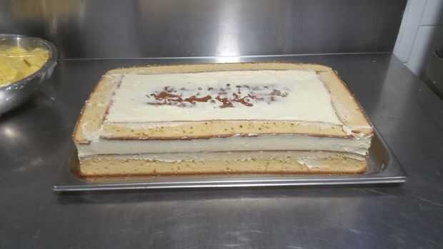 Extender una buena cantidad de crema sobre la zona externa superior de la torta y pegar los adornos en ella. Conjunto en la nevera.