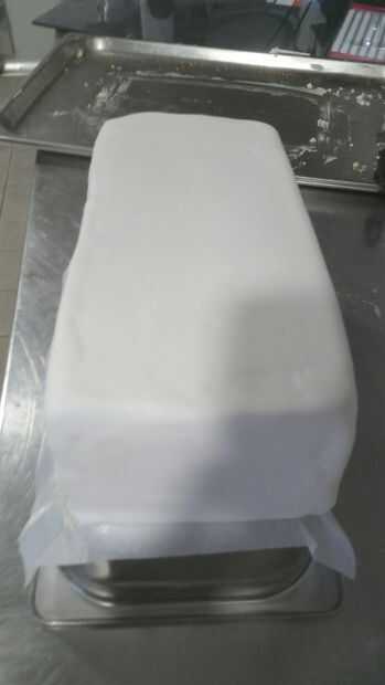 Espolvorear azúcar glass sobre la mesa y amasar el fondant para 5 minutos. Estirar el fondant a 3mm de espesor y asegúrese de que su la correcta longitud y ancho. Si su se adhiera a la aspersión de banco azúcar glas. Rodillo el fondant alrededor de su palote y estirar suavemente sobre la torta. Trabajar de arriba abajo liso el fondant usando los pulidores de fondant. Trate de no usar las manos a calentar el fondant hacer pegajoso. Corte cualquier exceso (fondant).