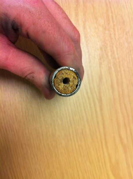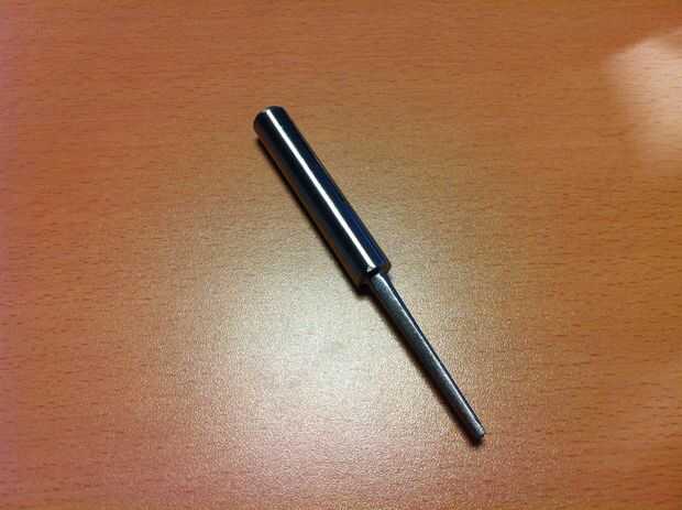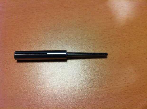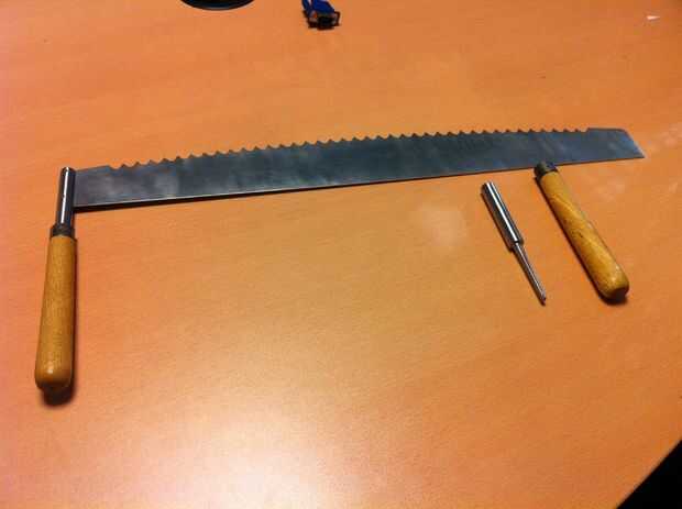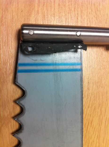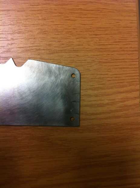 Después de dar vuelta, la espiga se enfrentaron con una lima gruesa. Los agujeros fueron perforados muy cuidadosamente a alinee con los agujeros en la hoja. La ranura fue aserrada a mano otra vez con cuidado para que sea recto para adaptarse a la hoja. Arena archivos de papel y la aguja se usaron para obtener la ranura lo suficientemente amplia como para adaptarse a la hoja. Se tuvo cuidado al probar el ajuste sólo deslizar sobre los extremos que se cubriría una vez instalado de todos modos para evitar cualquier arañazos visibles.