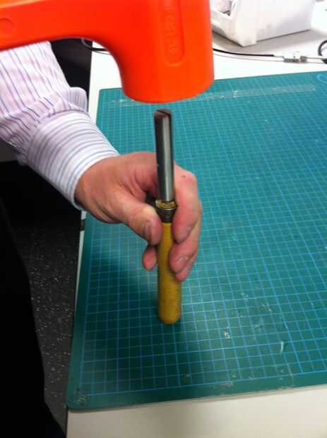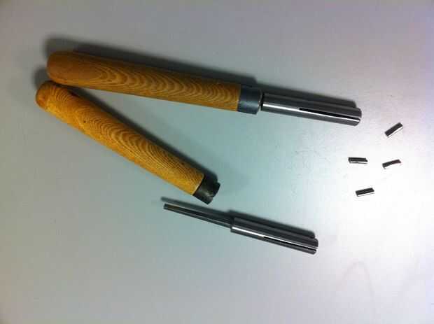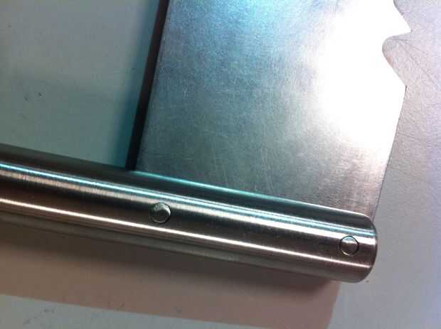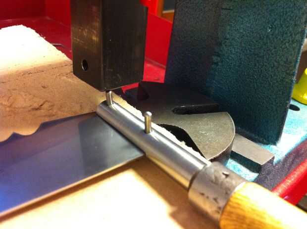 Conectar el adaptador a la hoja es un poco más difícil. En primer lugar usted necesita hacer algunos alfileres. Utilizamos varilla de acero inoxidable de 3mm para adaptarse a nuestros agujeros de 3mm. Como era de esperar, una vez alineado estos no van a quedarse. Flexión de la articulación gradualmente pasearlos fuera del agujero. Así que para mantenerlos firmemente dimos las patillas un poco de un mullering para hacerlos menos circular. Golpeó un extremo con un martillo y sobre la apretada en un tornillo de banco para hacerla menos circular. Nos también ligeramente doblados el pin tal que podría estar presionado pero fue sostenido por la fuerza del adaptador lo endereza. Antes del montaje, los pernos se presentaron ronda a la curvatura aproximada del adaptador así que encajan muy bien una vez presionado.