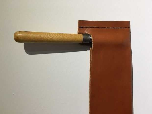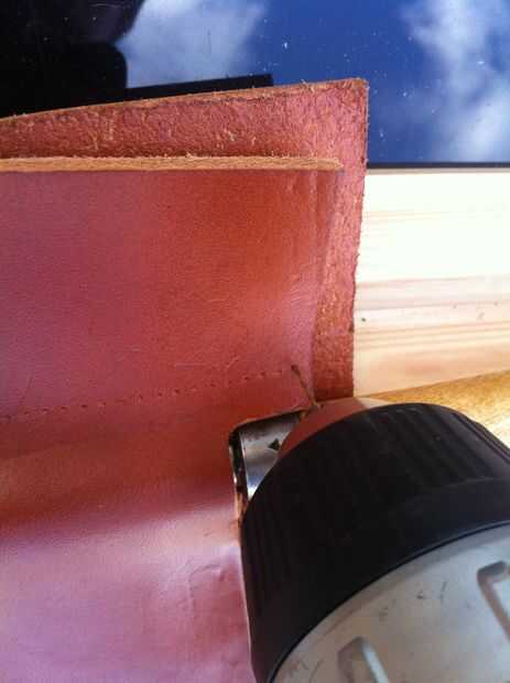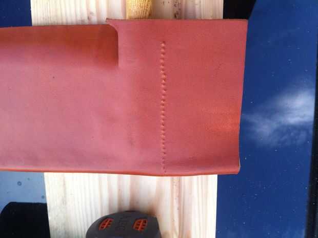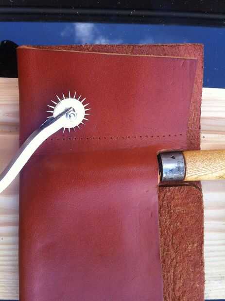 Para ello que he utilizado una rueda de pasador de cuero para hacer algunos agujeros en el cuero uniformemente a lo largo de una línea de puntadas a través. He encontrado que cualquier aguja que mi hilo extra grueso encajaba a través de los agujeros para que los amplió con broca de 0,9 mm micro. Después de la costura era mucho más fácil.