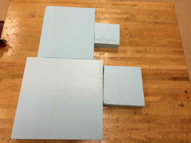 Hay cuatro capas a esta "torta" y cada uno se reducirá de 2 pulgadas de espuma de poliestireno; cada pieza se corta con la sierra. Dependiendo del tamaño de la torta dependerá de las medidas de cada pieza cortada. Cada pieza ser mucho más pequeño que el anterior. La creación de la torta de la capa.