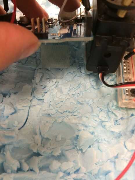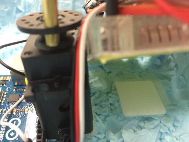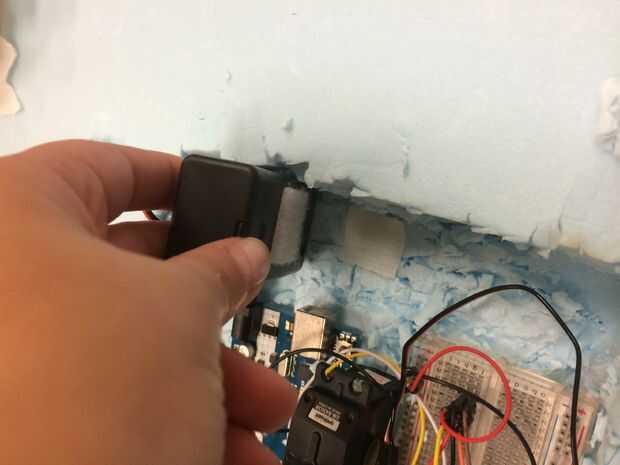 Aplane el interior cuadrado. Coloque el motor en el centro de la Plaza. Colocar el ardunio a la izquierda del motor y el tablero de criados a la derecha del motor. Una vez en el lugar correcto use velcro en cada pieza para asegurar el motor ardunio y criados de la Junta. La batería será de velcro en el exterior de la segunda capa, en el lado.