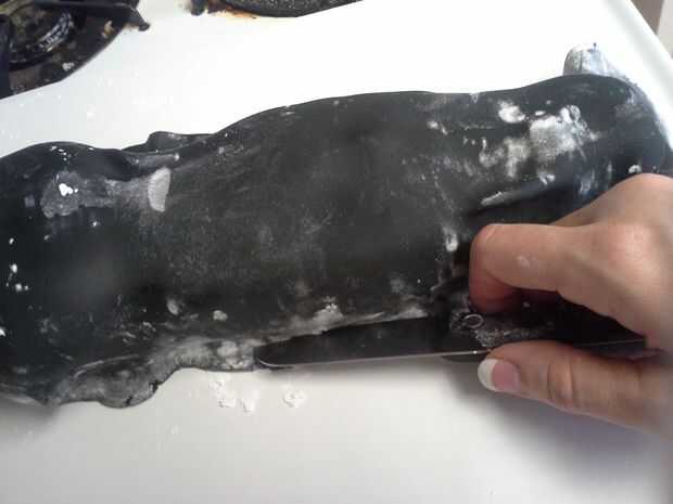 Pulsa el fondant en la parte inferior de la torta, donde la torta reúne la Junta Directiva. Utilice un cuchillo afilado para cortar el fondant sobrante del pastel.