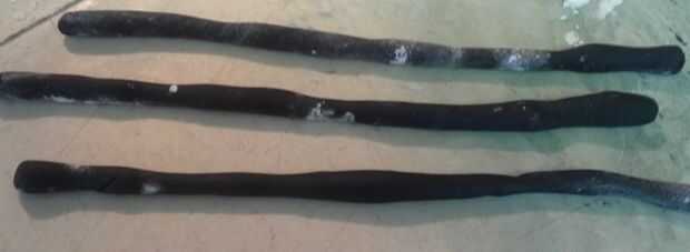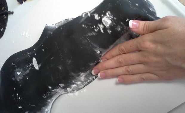 Tirón 3, 1/2-inch bolas de fondant del exceso y el rodillo y forma en 3, 6-pulgadas largas tiras.