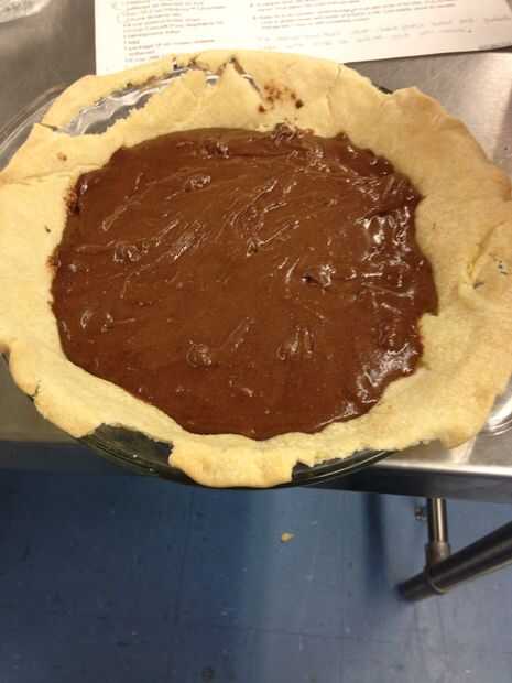 Mix 1 caja de mezcla de brownie de chocolate chunk. Añadir virutas de mantequilla de maní en la mezcla. Precalentar el horno a 350. A continuación vierta el brownie en la corteza y dejar cocinar durante unos 20 minutos hasta que se hace el brownie.