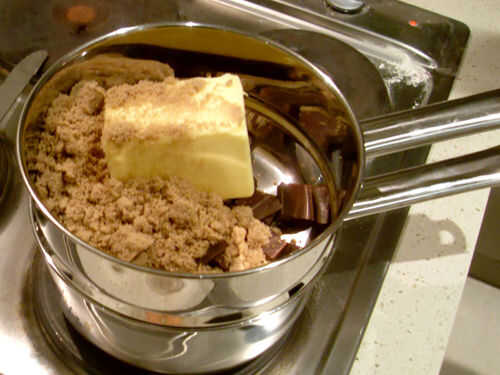 Combine la mantequilla, chocolate y azúcar en una olla (yo usé una caldera doble porque tengo un horno eléctrico cutre) revolviendo constantemente.