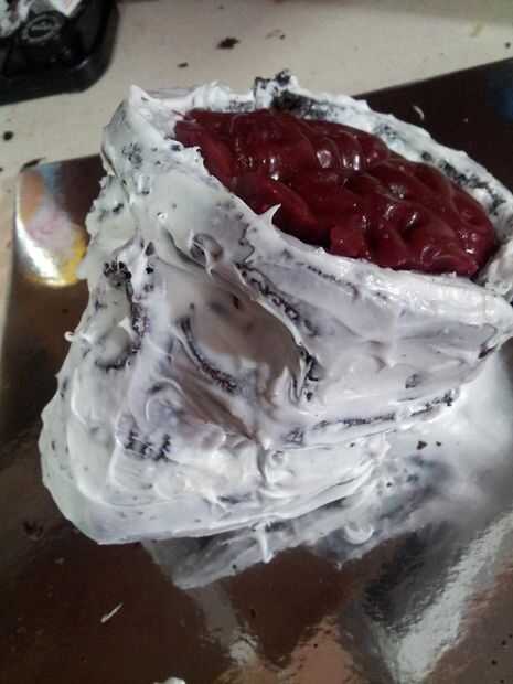 Después de conseguir las cavidades del cerebro talladas hacia fuera, es hora de heladas el pastel con una capa de migas.
