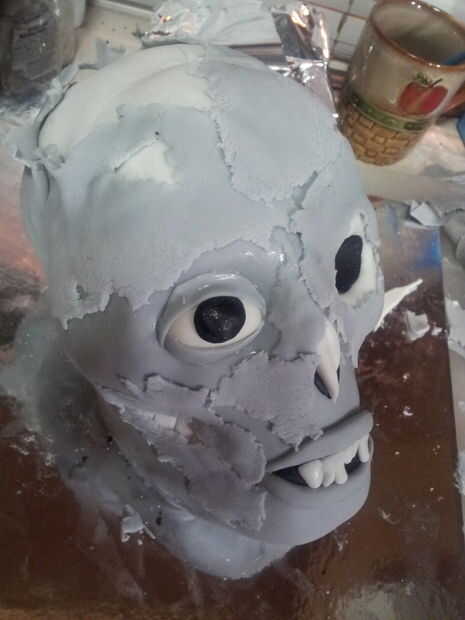 Para hacer que la piel, había desplegado a finas capas de pasta de azúcar y luego sólo tiró de cachas, dejando un borde irregulares y una apariencia con textura. Esculpió también los huesos nasal, un zócalo del ojo vacío y la parte superior del cráneo expuesto a través de la piel rasgada, así como características básicas como los dientes, una boca y un ojo.