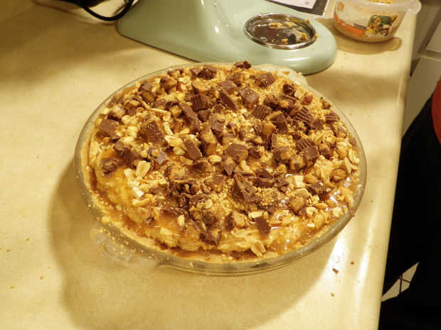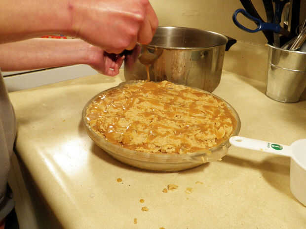 Completamente la tapa de la empanada de la mantequilla de cacahuete con el maní restante y mantequilla de maní.
