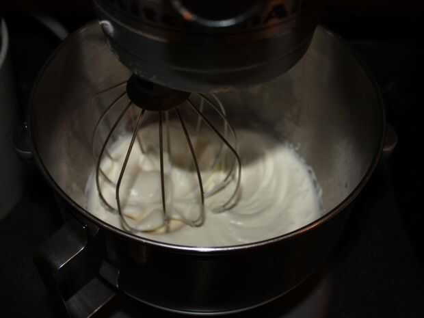 Poco a poco Vierta la gelatina en el bol sin dejar de batir la crema. Batir hasta que formen picos.